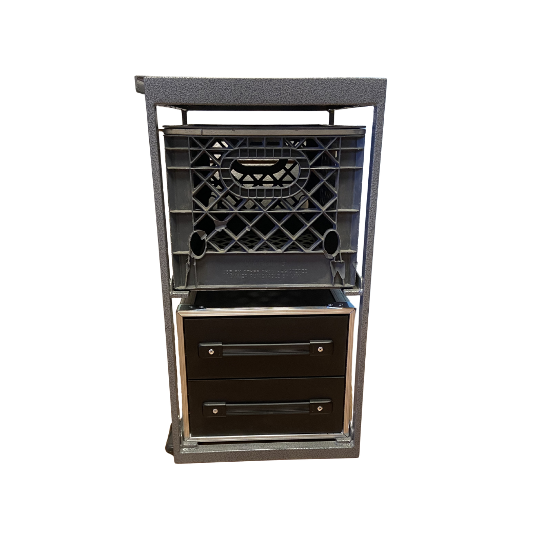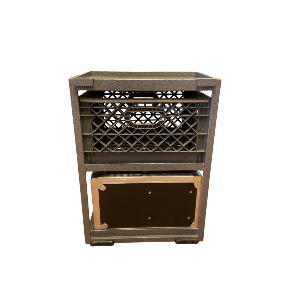 Milk Crate Caddy for 2 milk crates rests on any half inch bar on our our carts. Add more milk crate space to your Studio Cart. Professional Carts and accessories designed for the Motion Picture and the Television Industries. Twenty years of practical solutions and innovations. Specializing in multipurpose support equipment that has redefined production for the 21st century.